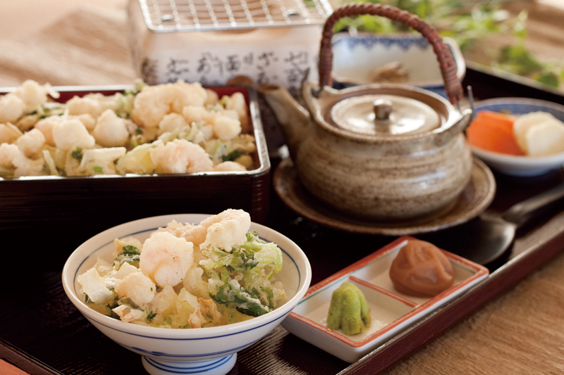 今月のおすすめメニューは【芝海老と小柱の天まぶし】です。