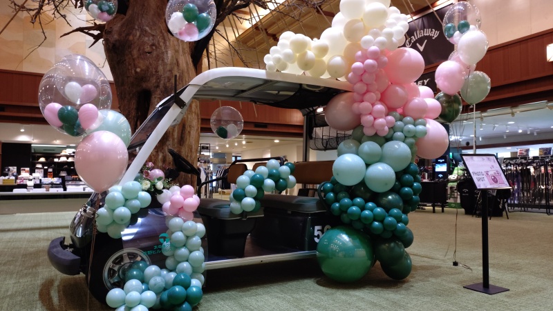 9月22日(月)から10月5日(日)にかけて太平洋クラブで参加する「Women's Golf Now」にあわせて、カートを鮮やかなバルーンで飾ったフォトスポットをクラブハウス内に設けました。この期間は女性へのプチプレゼントサービスや9月29日(月)にレディースコンペなどを開催しますので、ぜひ佐野ヒルクレストコースへお越しください!(9/21、吉野)