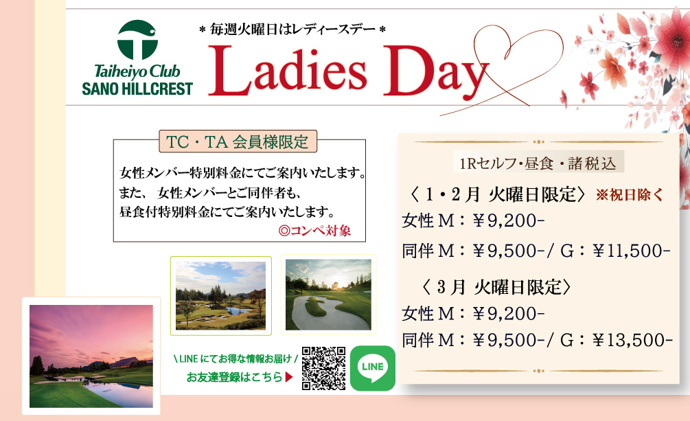 | 料金 | 〈 1・2月火曜日限定 〉 ■太平洋クラブ・太平洋アソシエイツ女性会員:9,200円 ■太平洋クラブ・太平洋アソシエイツ会員:9,500円 ■WebShot会員および同伴ゲスト:11,500円 〈 3月火曜日限定 〉 ■太平洋クラブ・太平洋アソシエイツ女性会員:9,200円 ■太平洋クラブ・太平洋アソシエイツ会員:9,500円 ■WebShot会員および同伴ゲスト:13,500円 ※1Rセルフ・ゴルフ場利用税・昼食・ジュニア等育成協力金・消費税込 |