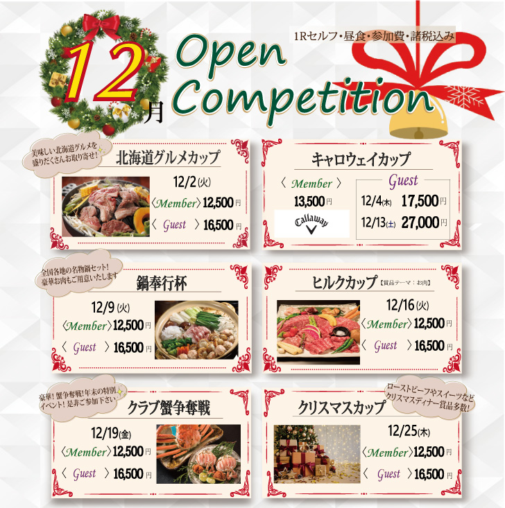 参加費 | ■太平洋クラブ・太平洋アソシエイツ会員:[12/2(火)、12/9(火)、12/16(火)、12/19(金)、12/25(木):12,500円] 〔12/4(木)、12/13(土)、12/30(火):13,500円] ■WebShot会員および同伴ゲスト [12/2(火)、12/9(火)、12/16(火)、12/19(金)、12/25(木):16,500円] [12/4(木):17,500円][12/13(土):27,000円][12/30(火):22,500円] ※1Rセルフ・昼食・エントリーフィ・ゴルフ場利用税・ジュニア等育成協力金・消費税込 ※キャディ付(1R・4B)の場合プラス4,400円 |