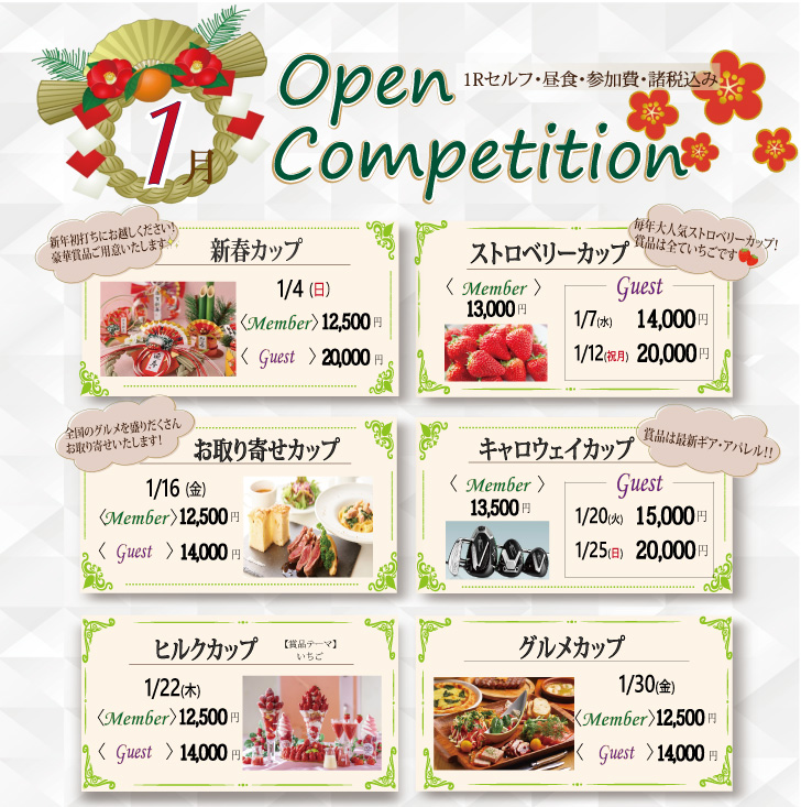 | 参加費 | ■太平洋クラブ・太平洋アソシエイツ会員:[1/4(日)、1/16(金)、1/22(木)、1/30(金):12,500円] 〔1/7(水)、1/12(祝月):13,000円]〔1/20(火)、1/25(日):13,500円] ■WebShot会員および同伴ゲスト [1/7(水)、1/16(金)、1/22(木)、1/30(金):14,000円][1/20(火):15,000円] [1/4(日)、1/12(祝月)、1/25(日):20,000円] ※1Rセルフ・昼食・エントリーフィ・ゴルフ場利用税・ジュニア等育成協力金・消費税込 ※キャディ付(1R・4B)の場合プラス4,400円 |