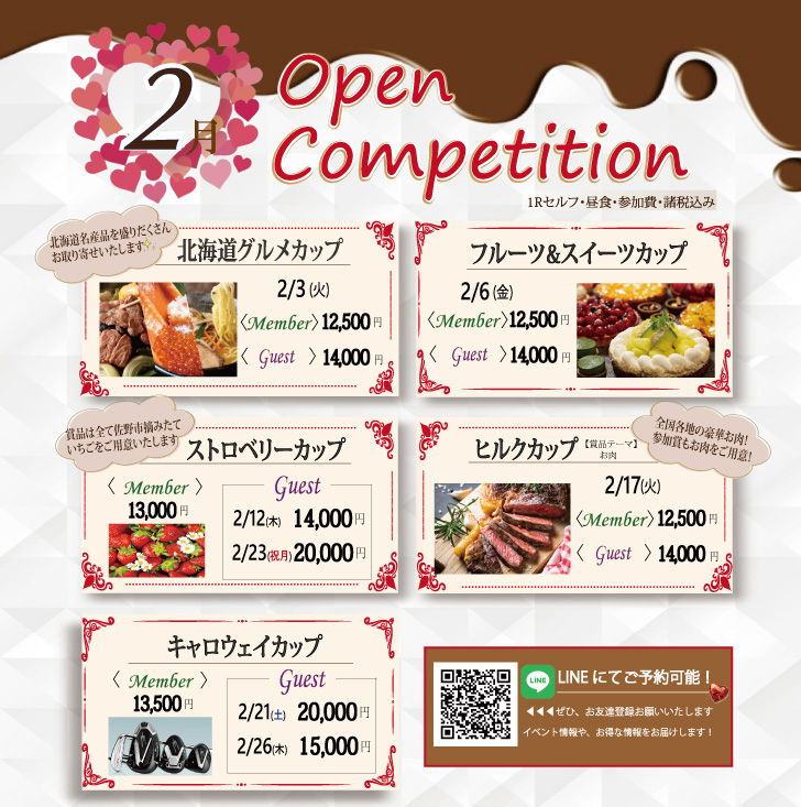 | 備考 | ※パーティ、表彰式はございません。 ※ホールアウト後フロント前にて賞品をお渡し致します。 |