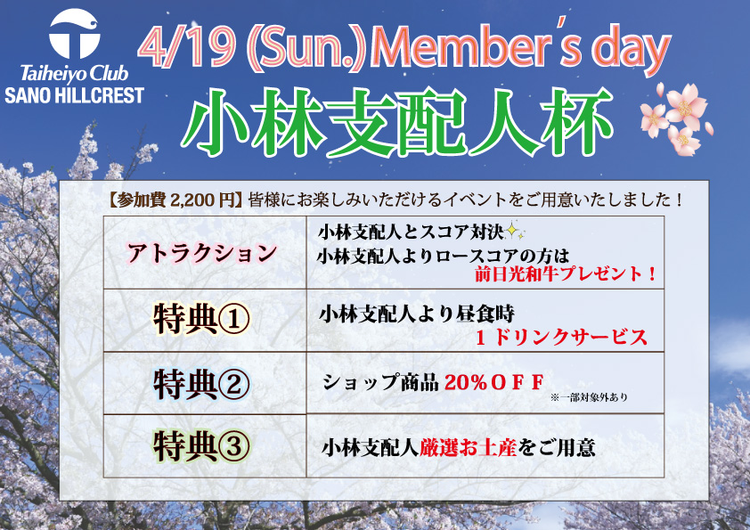 | プラン名 | 【Member'sday】4/19(日) 小林支配人杯 |