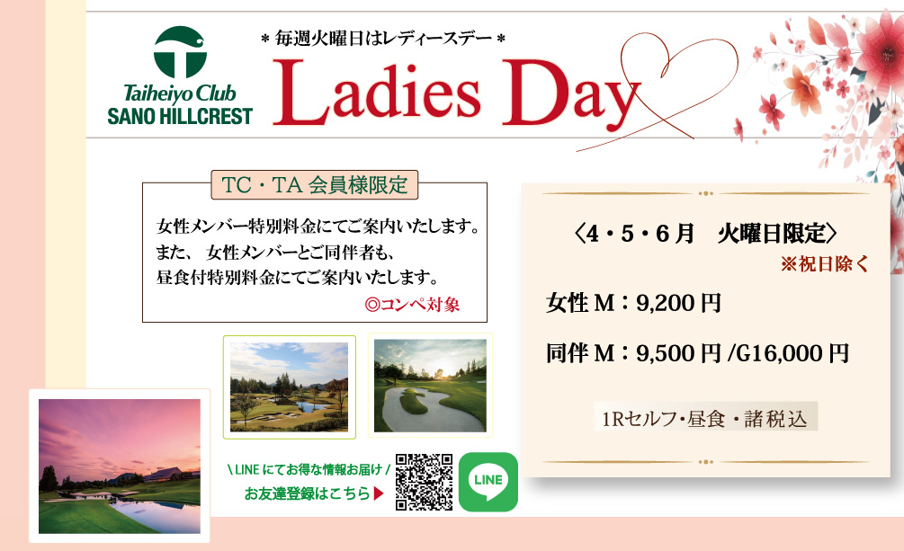 | 料金 | 〈 4~6月火曜日限定 〉※祝日除く ■太平洋クラブ・太平洋アソシエイツ女性会員:9,200円 ■太平洋クラブ・太平洋アソシエイツ会員:9,500円 ■WebShot会員および同伴ゲスト:16,000円 ※1Rセルフ・ゴルフ場利用税・昼食・ジュニア等育成協力金・消費税込 |