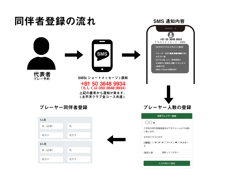 プレーヤーの同伴者登録に関して、予約代表者様へSMS(ショートメッセージ)による確認を行う新しいシステムを導入いたします。