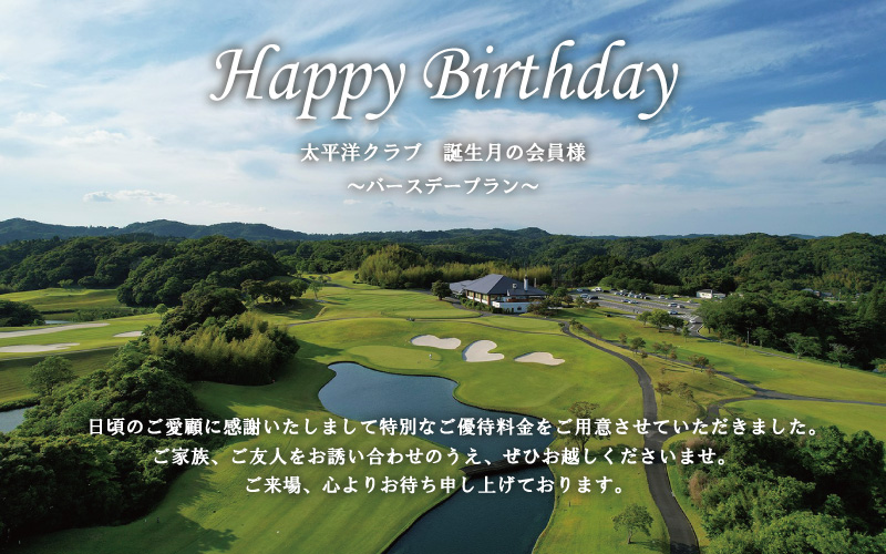| 料金 | ●5月誕生月 ご本人様 太平洋クラブ会員・アソシエイツ会員:7,900円 ●ご同伴者様 太平洋クラブ会員・アソシエイツ会員:9,400円 同伴ゲスト様:13,500円 (1Rセルフプレー・昼食付・ゴルフ場利用税・消費税・ジュニア育成協力金込) |