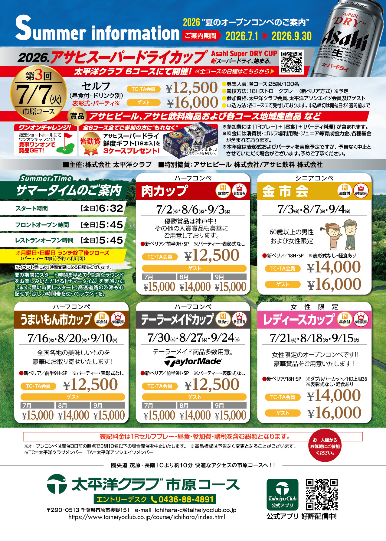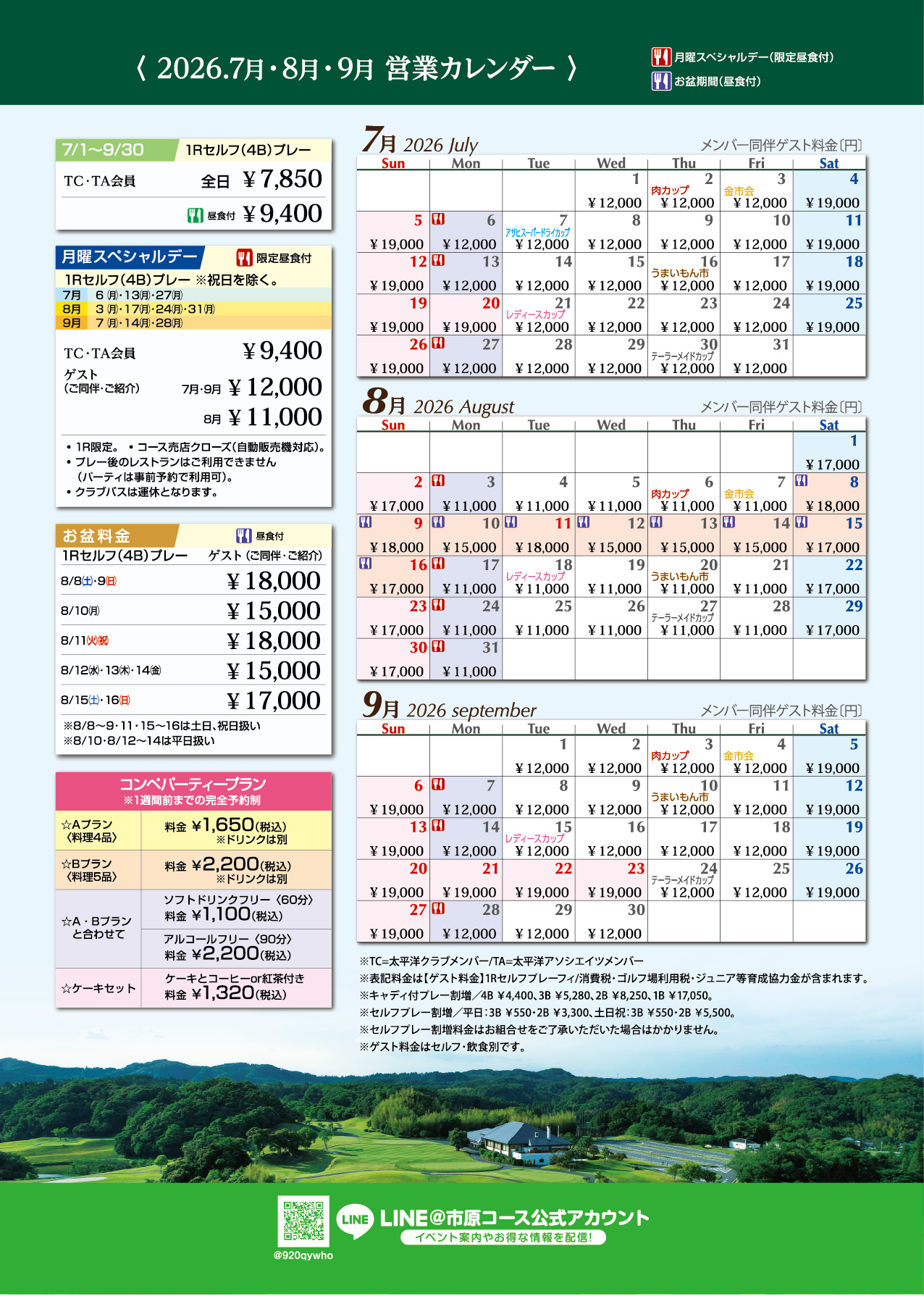 夏のオープンコンペのご案内 /2026年7-9月営業カレンダー