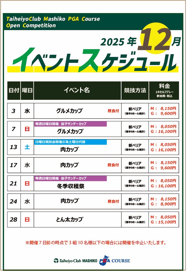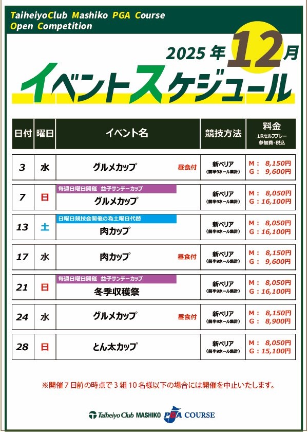 | 内容・特典 | 益子PGAコース12月のイベントご案内いたします。 栃木県のうまいものをとりそろえた『グルメカップ』、地元産の高級肉を使用した『肉カップ』、女性に大人気の『スイーツカップ』、地元名産品を使用したとん太カップなどカップなど様々なイベントをご用意いたしました。 どなた様もお楽しみいただける内容なっておりますので、奮ってご参加ください。 お待ちしております。 |