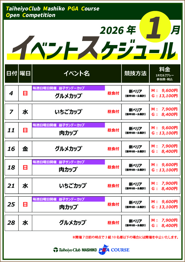 | 内容・特典 | 益子PGAコース1月のイベントご案内いたします。 栃木県のうまいものをとりそろえた『グルメカップ』・地元名産とちあいかを使用した『いちごカップ』等、益子PGAコースならではの様々なイベントをご用意いたしました。 どなた様もお楽しみいただける内容なっておりますので、奮ってご参加ください。 お待ちしております。 |