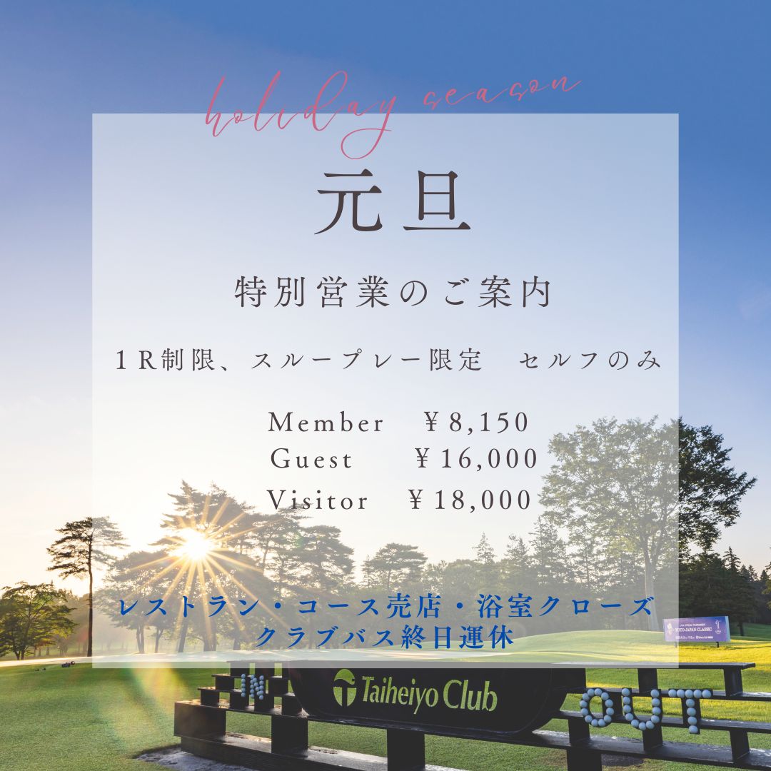 | 備考 | ≪元旦特別営業のご案内≫ ◆1R限定・スルー・セルフプレーのみとなります。 ◆レストラン・コース売店・浴室終日クローズとなります。 ◆クラブバスは終日運休となります。 ◆4バッグ以外は割増料金を別途頂戴いたします。 ※セルフ3B時プラス550円、2B時プラス2,200円。 ※事前にお組合せのご了承をいただている場合はかかりません。 ※ゲスト様のみでのお組合せはお受けしておりません。 ※ご同伴者の登録はプレー日1週間前までにお願いいたします。 ◆他の企画・優待券等との併用はできません。 |