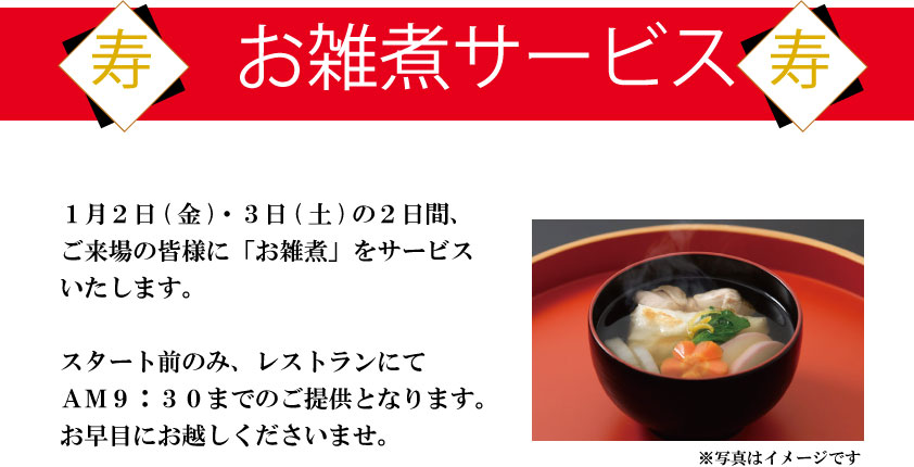 | 備考 | 1月2日(金)・3日(土)の2日間限定 ご来場の皆様に【お雑煮】のサービスをいたします。 スタート前のAM9:30までレストランにて提供しております。 お早目にお越しくださいませ。 |
