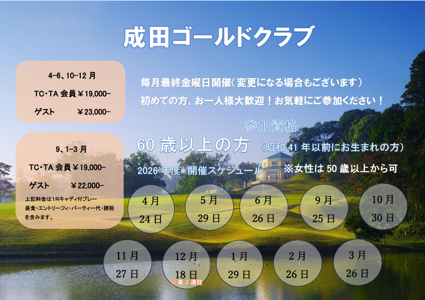 | 参加費 | ■太平洋クラブ会員:19,000円 ■太平洋アソシエイツ会員:19,000円 4月~6月、10月~12月 ■ゲスト:23,000円 9月、1月~3月 ■ゲスト:22,000円 ラウンド後、パーティがございます。 パーティーにご参加されず、賞品の配送をご希望の際は着払い発送となります。 ※1Rキャディ付・昼食・エントリーフィ・パーティ代・ジュニア等育成協力金・ゴルフ場利用税・消費税が含まれております。 ※1名からご予約可能です。また、2名以下の場合は組合せとなります。 |