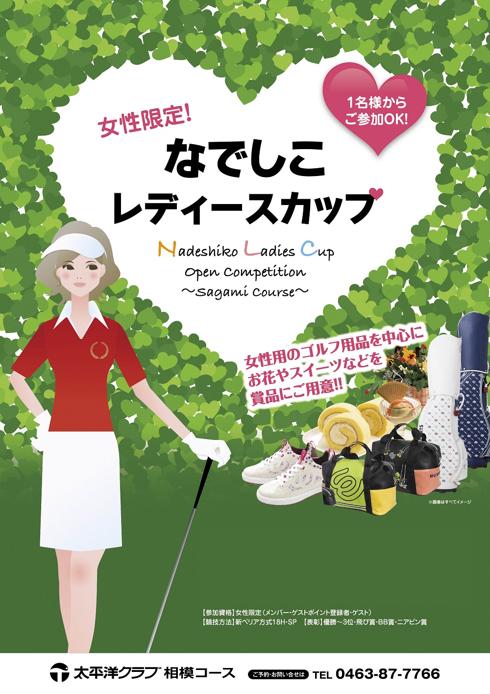 | 備考 | **ご予約はお電話にて承ります** 女性限定のオープンコンペとなります!! 昼食付+賞品付+パーティ料理付の特別プランでご用意しております。 ※キャディをご希望の場合は別途¥4,400/1人を頂いております。 ※他の企画、優待券との併用はできません。 ※ご予約はお電話にて承ります。 |