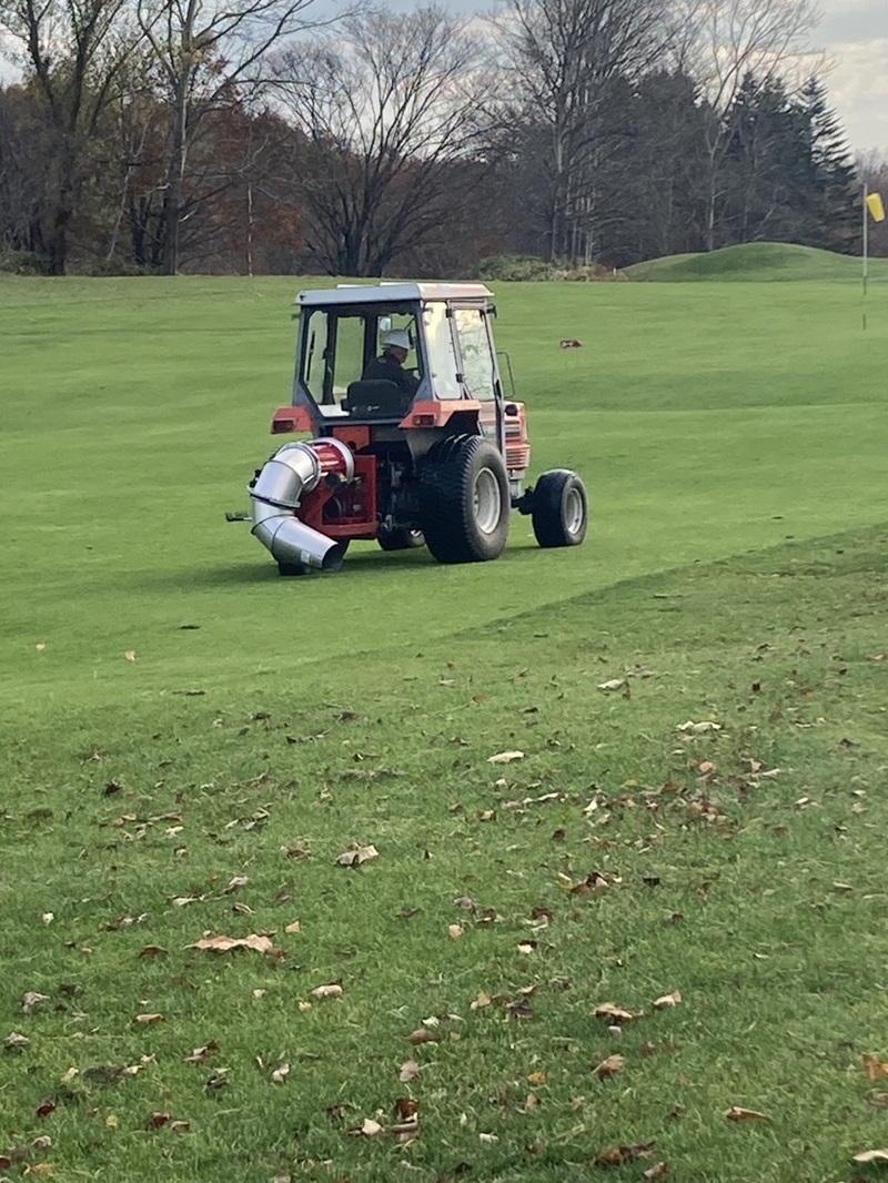 この時期はどうしてもフェアウェイに落ち葉が舞ってしまうため、ブロワでコース外へ吹き払い清掃をします。