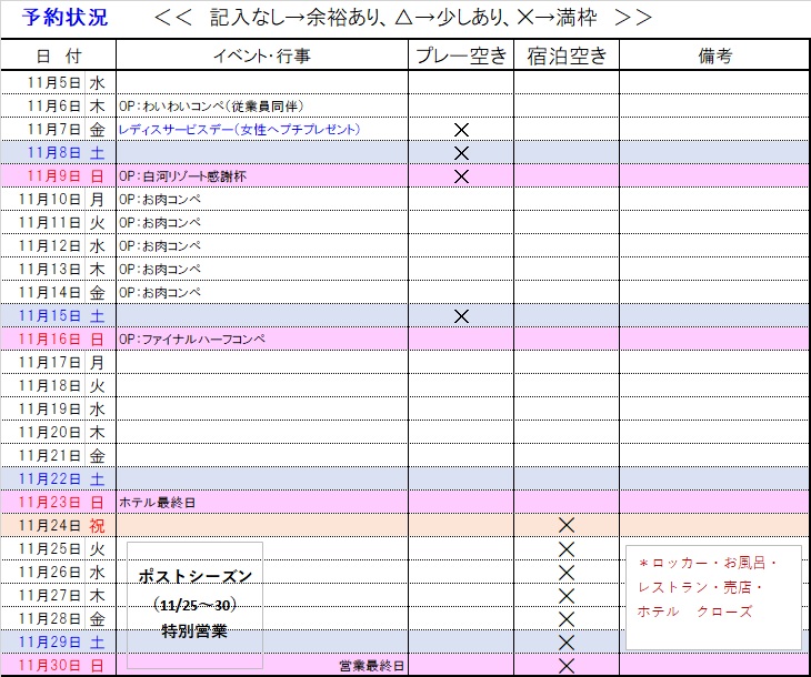 ・レストラン・お風呂・コース売店・ホテル・ロッカーはクローズ