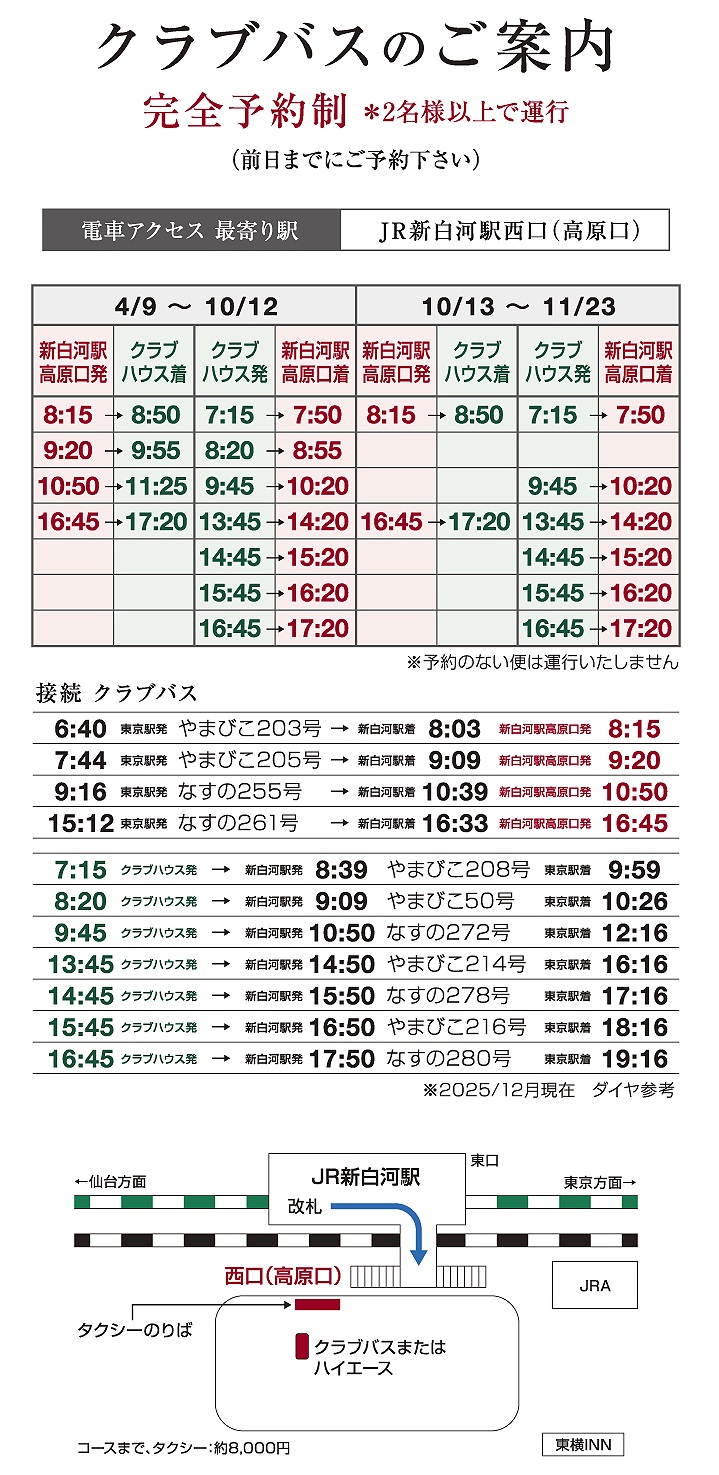 東京駅9:16発の新幹線利用し、クラブバスで11:30頃コース着。午後プレー後宿泊し、翌日プレーを含めた1泊2プレーがおすすめです。