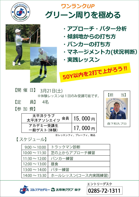 2026.01.01 ワンランクUP|グリーン周りを極める 3/21(土) アプローチの精度を上げてスコアUP! まずはアプローチの分析から始まり、状況別の打ち方を伝授。 50Yを2打で上がれる近道がここに! 2026年3月1日(日)有名シニア... アカデミー体験レッスンキャンペーン...