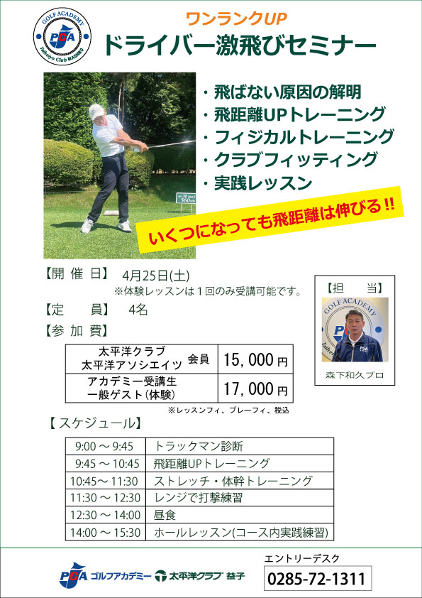 2026.02.02 ワンランクUP|ドライバー激飛びセミナー 4/25(土) 今より20ヤード、30ヤードと更なる飛距離UPをお望みの皆様に結果でお応えします! 20ヤード伸びればセカンドのクラブ3番手は変わります。 レッスン後にセカンドの景色が違って見える事間違いなし! アカデミー体験レッスンキャンペーン...