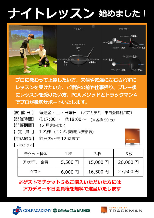 ナイトレッスン始めました! プロに教わって上達したい方、天候や気温に左右されずにレッスンを受けたい方、ご宿泊の前や仕事帰り、 プレー後にレッスンを受けたい方、PGAメソッドとトラックマン4でプロが徹底サポートいたします。 佐藤プロ|Round Lesson|9月 10月レッスンカレンダー